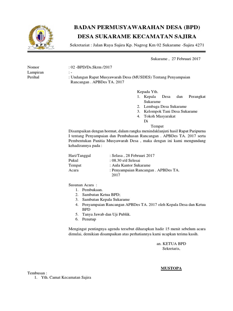 Contoh Surat Undangan Rapat Bpd Desa Sample Surat Undangan from 0.academia-photos.com Contoh pembukaan acara musyawarah masyarakat desa. Surat undangan rapat perusahaan dibuat ketika ingin mengadakan rapat yang ditujukan pada pihak yang dibutuhkan kehadirannya dalam rapat. Sehubungan akan dilaksanakannya musyawarah dalam rencana pembangunan jangka menengah desa (rpjmdes), maka kami mengundang kepada bapak/ibu/saudara/i untuk dapat menghadiri acara musyawarah. Contoh surat undangan resmi 1. Contoh surat undangan musyawarah desa. Documents similar to surat undangan rapat desa.docx. Silahkan anda download contoh draft ba musyawarah bpd dalam rangka. Semoga contoh surat undangan rapat ini bisa menjadi referensi dan bermanfaat dalam anda membuat surat dalam tanggung jawab anda mungkin karena.