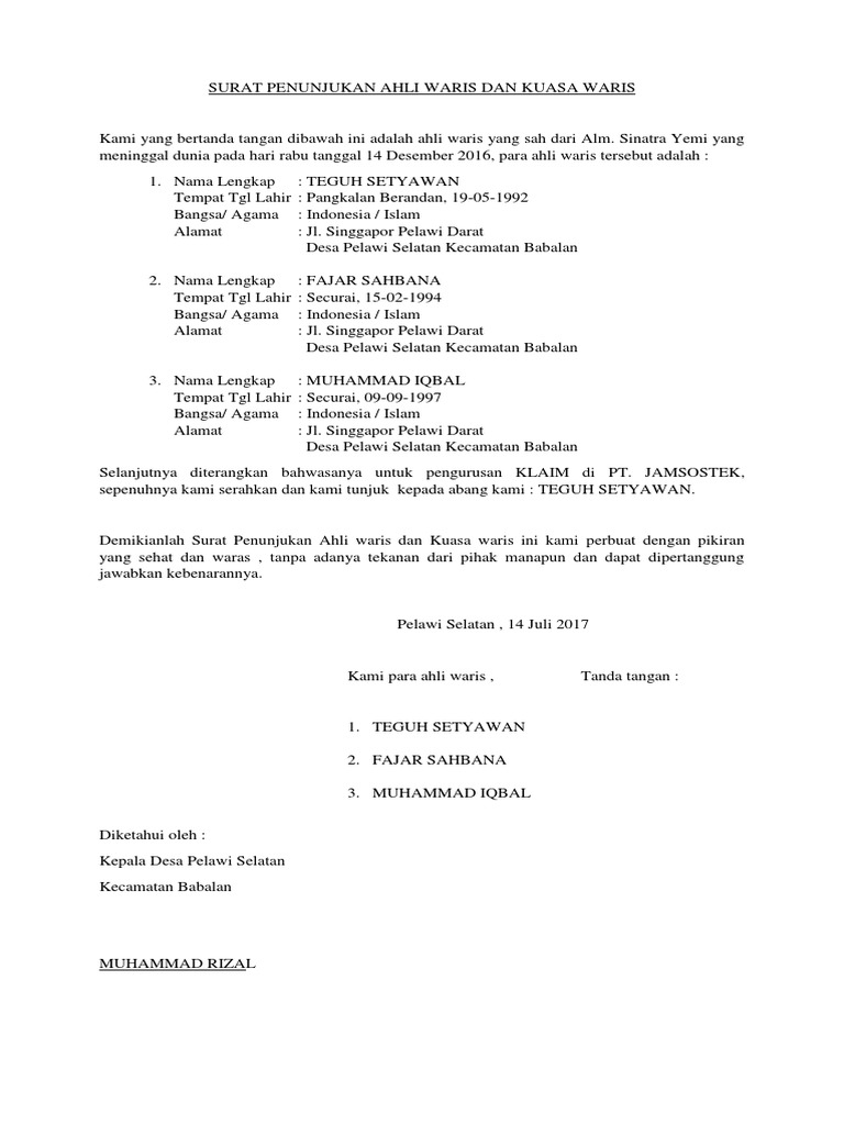 Tanpa adanya surat ini, seseorang yang dianggap ahli waris tidak bisa mengambil dan menguasai harta warisan peninggalan pewaris, walaupun memang. 15 contoh surat keterangan ahli waris yang resmi dan sah. Surat pernyataan pahami jenis dan cara buatnya dengan baik. Agar lebih jelas, mari simak contoh dalam contoh surat kuasa ahli waris paling lengkap harus dicantumkan dengan betul terkait dengan tanggal dan tempat penandatanganan surat kuasa. 37 rt 010, rw 007 wuryantoro wonogiri jawa tengah no.