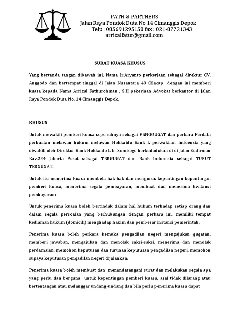 Untuk mewakili pemberi kuasa sepenuhnya sebagai penggugat dalam perkara perdata perbuatan melawan hukum melawan pt contoh surat kuasa khusus perdata. Contoh surat kuasa khusus pengambilan bpkb, gaji, uang, ijazah, paspor, dokumen, barang.
