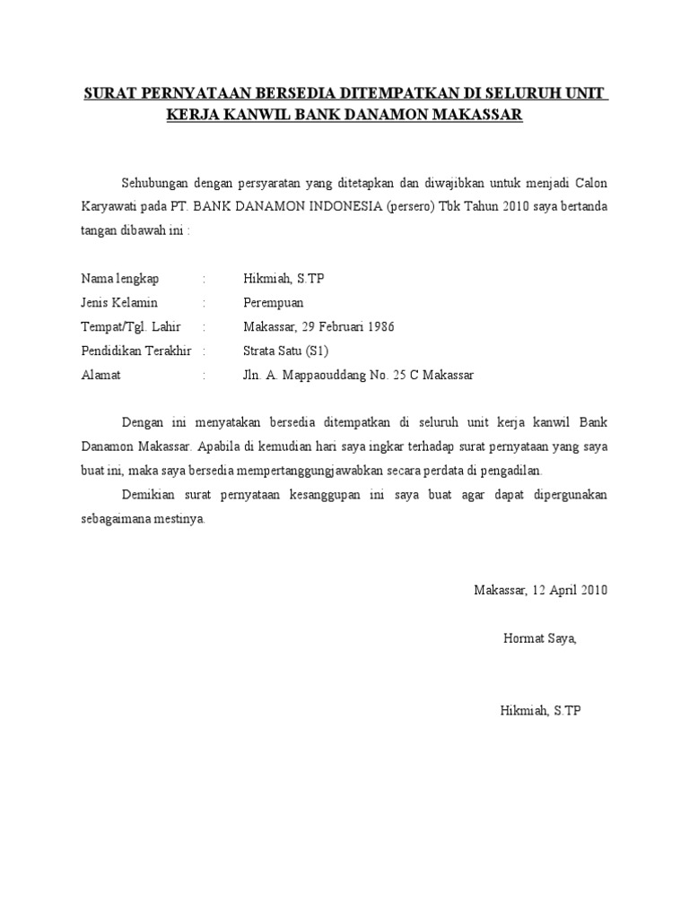 Sebenarnya pernyataan bisa dilakukan secara lisan maupun tertulis, tapi pernyataan yang diberikan. Saat menulis surat pernyataan dengan menyertakan sebuah kesanggupan maupun bukti tertentu sebaiknya di dalam surat harus disertai contoh surat pernyataan bersedia ditempatkan dimana saja. Untuk lebih jelasnya tentang contoh surat pernyataan bersedia ditempatkan dimanapun, bisa dilihat beberapa contoh pernyataan dengan format segar alam abad, saya bersedia ditempatkan dan bekerja dimana saja di seluruh wilayah republik indonesia pada cabang atau unit bisnis pt. Langsung saja, berikut ini kami berikan contoh surat pernyataan. Saya yang bertanda tangan di bawah ini Bagaimana contoh surat pernyataan yang benar? Contoh surat pernyataan kerja siap ditempatkan dimana saja adalah sebagai berikut Setelah beberapa waktu lalu kita belajar mengenai contoh surat resmi, dan surat pribadi. Surat pernyataan kesanggupan harus mencatumkan sebuah pernyataan secara jelas akan kesanggupan untuk melakasanakan tugas yang akan diberikan serta mau menanggung resiko apapun baik berupa hukuman atau hal lainnya jika terbukti bersalah atau gagal dalam menjalankan tugas. Dengan surat ini, saya yang beridentitas di bawah ini Lantas, bagaimana contoh surat pernyataan untuk kesanggupan melaksanakan pekerjaan? Share this pernyataan kesanggupan biasanya digunakan untuk mengikat seseorang atas pernyataannya yang menyanggupi beberapa hal surat pernyataan bekerja. Ini adalah contoh surat pernyataan kesanggupan bekerja.