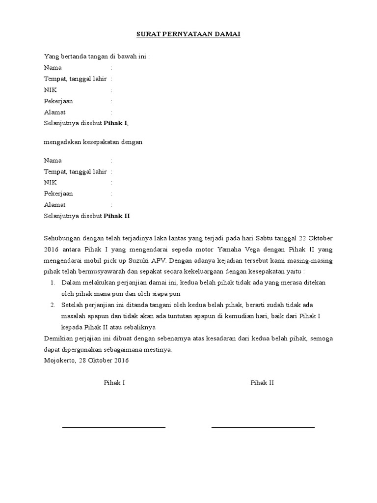 Surat pernyataan merupakan sebuah kesanggupan seseorang atas sebuah kesepakatan dengan pihak terkait, seperti lebaga atau perusahaan secara tertulis dan sifatnya resmi. Surat pernyataan biasanya dibuat oleh orang yang ingin menerangkan sesuatu agar bisa dipercaya oleh penerima surat. Di sebut pihak i,mengadakan kesepakatan pasal 3 surat perjanjian perdamaian ini akan digunakan pihak kedua untuk mencabut bap yang sudah dilaporkan ke polsek pada tanggal 30. Berikut merupakan penjelasan mengenai surat perjanjian dan contohnya yang dapat dipelajari sahabat 99. Surat pernyataan perjanjian adalah surat / bukti tertulis yang mana akan menunjukkan bahwa beberapa pihak telah melakukan negosiasi yang telah membuahkan kesepakatan.